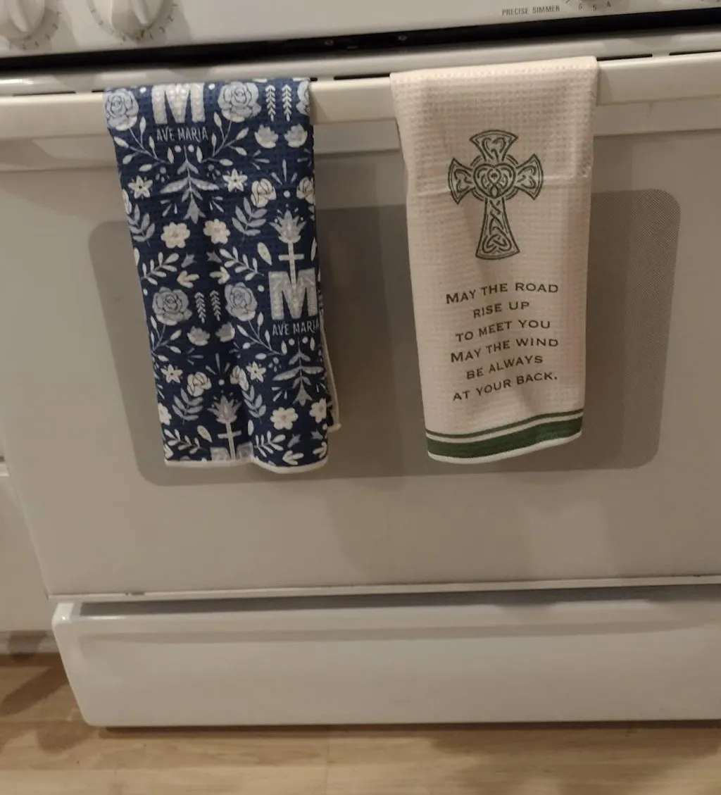 - Whether celebrating a Sacrament (Baptism, First Communion, Confirmation, Marriage), Holiday (Christmas, Easter, Pentecost, Mother’s Day, Father’s Day), Anniversary (Wedding, Ordination, Baptism, Becoming Catholic), Celebration (Birthday, Girl’s Night, Mom’s Night, Bible Study Gathering), or eating as a family on an ordinary day, these dish towels are sure to make your gathering more special, meaningful, and memorable.